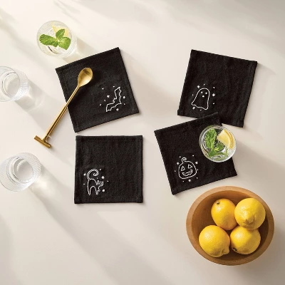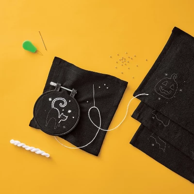 Surprise guests or trick-or-treaters with your own handpainted napkins by using the 4-Count of Halloween Craft Beaded Embroidery Napkins Kit from Mondo Llama™. Thia pack of four embroidery napkins kit includes embroidery floss, printed black napkins, needle and more to meet your embroidery needs. Simply follow the print, finish with bead detailing and add the napkins to your table decor.