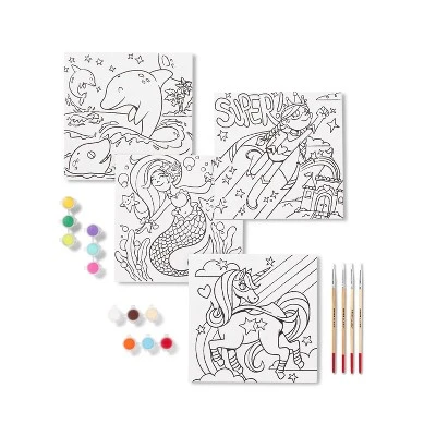 Start a fun new project with your kiddo with this 4-Piece Paint-Your-Own Canvas Panel Pack from Mondo Llama™. This paint-your-own pack features a mermaid canvas, dolphin canvas, unicorn canvas and superhero canvas to encourage your little ones to express their creative side. The set comes with 12 paints and 4 paintbrushes, giving you everything you need to mix up new colors and create unique creations. Perfect as a relaxing project on the weekend, this paint-your-own panel pack is sure to liven your day and home decor.